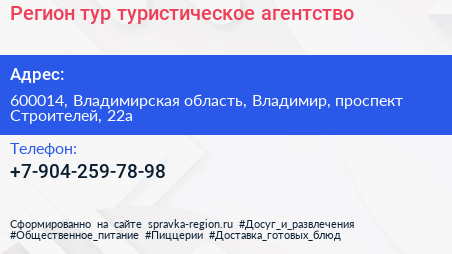 Регион тур, туристическое агентство по адресу 600014, Владимирская область, Владимир, проспект Строителей, 22а в дальнейшем Организация, размещена в следующих категориях: