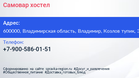 Самовар, хостел по адресу 600000, Владимирская область, Владимир, Козлов тупик, 3 в дальнейшем Организация, размещена в следующих категориях: