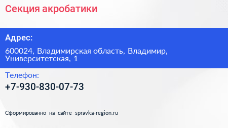 Секция акробатики по адресу 600024, Владимирская область, Владимир, Университетская, 1 в дальнейшем Организация, размещена в следующих категориях: