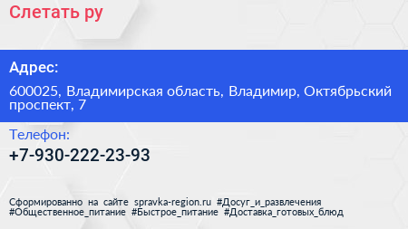 Слетать.ру по адресу 600025, Владимирская область, Владимир, Октябрьский проспект, 7 в дальнейшем Организация, размещена в следующих категориях:
