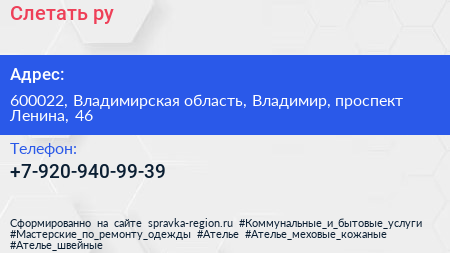Слетать.ру по адресу 600022, Владимирская область, Владимир, проспект Ленина, 46 в дальнейшем Организация, размещена в следующих категориях: