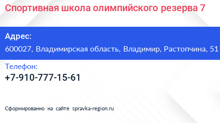 Спортивная школа олимпийского резерва №7 по адресу 600027, Владимирская область, Владимир, Растопчина, 51 в дальнейшем Организация, размещена в следующих категориях: