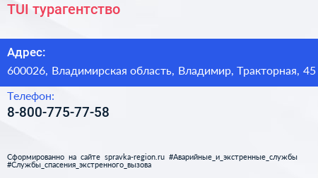 TUI, турагентство по адресу 600026, Владимирская область, Владимир, Тракторная, 45 в дальнейшем Организация, размещена в следующих категориях: