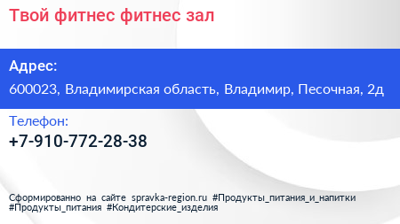 Твой фитнес, фитнес-зал по адресу 600023, Владимирская область, Владимир, Песочная, 2д в дальнейшем Организация, размещена в следующих категориях:
