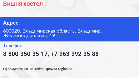 Вишня, хостел по адресу 600020, Владимирская область, Владимир, Железнодорожная, 19 в дальнейшем Организация, размещена в следующих категориях: