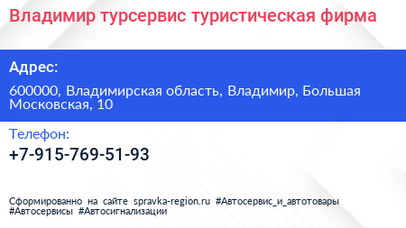 Владимир-турсервис, туристическая фирма по адресу 600000, Владимирская область, Владимир, Большая Московская, 10 в дальнейшем Организация, размещена в следующих категориях: