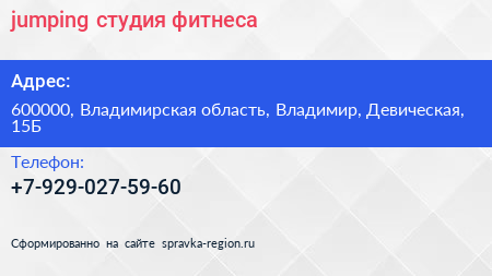 jumping, студия фитнеса по адресу 600000, Владимирская область, Владимир, Девическая, 15Б в дальнейшем Организация, размещена в следующих категориях:
