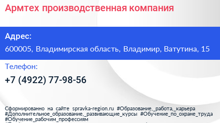 Армтех, производственная компания по адресу 600005, Владимирская область, Владимир, Ватутина, 15 в дальнейшем Организация, размещена в следующих категориях: