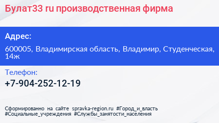 Булат33.ru, производственная фирма по адресу 600005, Владимирская область, Владимир, Студенческая, 14ж в дальнейшем Организация, размещена в следующих категориях: