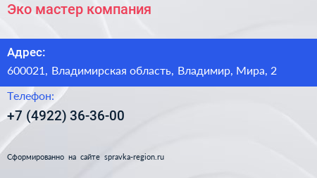 Эко-мастер, компания по адресу 600021, Владимирская область, Владимир, Мира, 2 в дальнейшем Организация, размещена в следующих категориях: