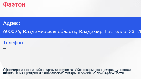 Фаэтон по адресу 600026, Владимирская область, Владимир, Гастелло, 23 к1 в дальнейшем Организация, размещена в следующих категориях: