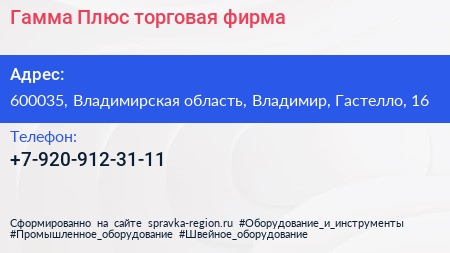 Гамма Плюс, торговая фирма по адресу 600035, Владимирская область, Владимир, Гастелло, 16 в дальнейшем Организация, размещена в следующих категориях: