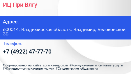 ИЦ При Влгу по адресу 600014, Владимирская область, Владимир, Белоконской, 3Б в дальнейшем Организация, размещена в следующих категориях: