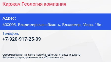 Киржач-Геология, компания по адресу 600005, Владимирская область, Владимир, Мира, 15в в дальнейшем Организация, размещена в следующих категориях: