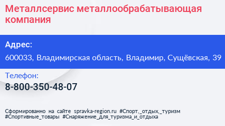 Металлсервис, металлообрабатывающая компания по адресу 600033, Владимирская область, Владимир, Сущёвская, 39 в дальнейшем Организация, размещена в следующих категориях:
