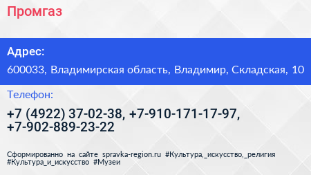 Промгаз по адресу 600033, Владимирская область, Владимир, Складская, 10 в дальнейшем Организация, размещена в следующих категориях:
