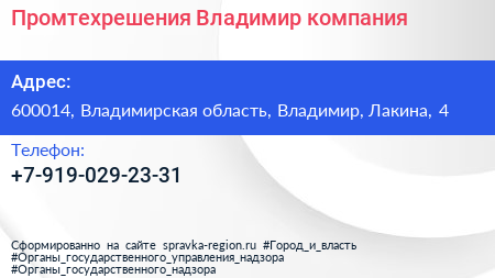 Промтехрешения-Владимир, компания по адресу 600014, Владимирская область, Владимир, Лакина, 4 в дальнейшем Организация, размещена в следующих категориях: