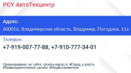 РСУ АвтоТехцентр по адресу 600016, Владимирская область, Владимир, Погодина, 11а в дальнейшем Организация, размещена в следующих категориях: