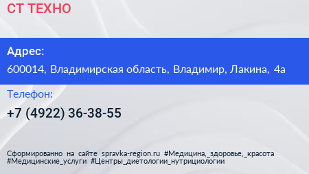 СТ-ТЕХНО по адресу 600014, Владимирская область, Владимир, Лакина, 4а в дальнейшем Организация, размещена в следующих категориях: