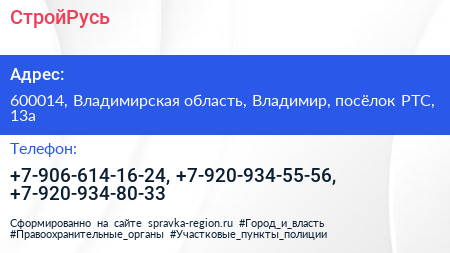 СтройРусь по адресу 600014, Владимирская область, Владимир, посёлок РТС, 13а в дальнейшем Организация, размещена в следующих категориях: