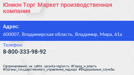 Юнион Торг Маркет, производственная компания по адресу 600007, Владимирская область, Владимир, Мира, 61а в дальнейшем Организация, размещена в следующих категориях: