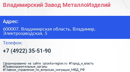 Владимирский Завод МеталлоИзделий по адресу 600007, Владимирская область, Владимир, Электрозаводская, 5 в дальнейшем Организация, размещена в следующих категориях: