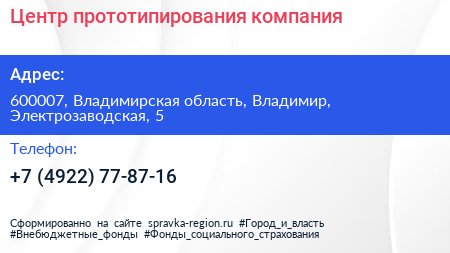 Центр прототипирования, компания по адресу 600007, Владимирская область, Владимир, Электрозаводская, 5 в дальнейшем Организация, размещена в следующих категориях:
