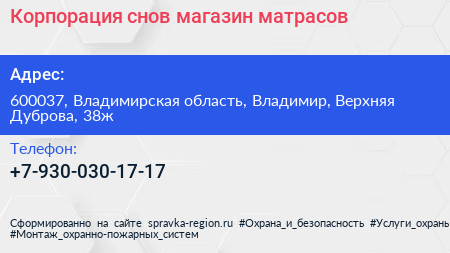Корпорация снов, магазин матрасов по адресу 600037, Владимирская область, Владимир, Верхняя Дуброва, 38ж в дальнейшем Организация, размещена в следующих категориях:
