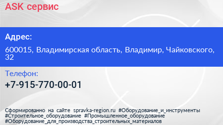 ASK сервис по адресу 600015, Владимирская область, Владимир, Чайковского, 32 в дальнейшем Организация, размещена в следующих категориях: