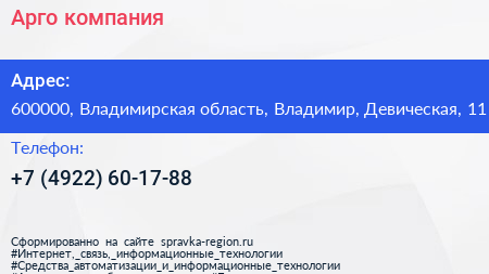 Арго, компания по адресу 600000, Владимирская область, Владимир, Девическая, 11 в дальнейшем Организация, размещена в следующих категориях: