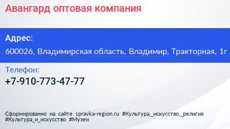 Авангард, оптовая компания по адресу 600026, Владимирская область, Владимир, Тракторная, 1г в дальнейшем Организация, размещена в следующих категориях: