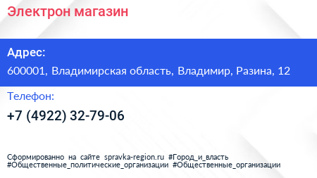 Электрон, магазин по адресу 600001, Владимирская область, Владимир, Разина, 12 в дальнейшем Организация, размещена в следующих категориях:
