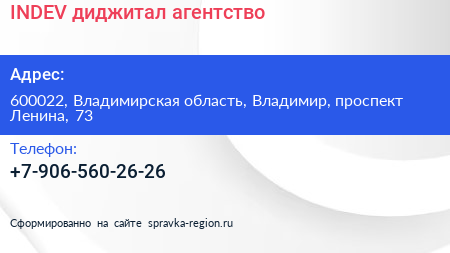 INDEV, диджитал-агентство по адресу 600022, Владимирская область, Владимир, проспект Ленина, 73 в дальнейшем Организация, размещена в следующих категориях: