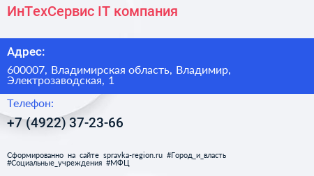 ИнТехСервис, IT-компания по адресу 600007, Владимирская область, Владимир, Электрозаводская, 1 в дальнейшем Организация, размещена в следующих категориях: