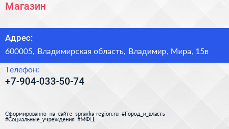 Магазин по адресу 600005, Владимирская область, Владимир, Мира, 15в в дальнейшем Организация, размещена в следующих категориях: