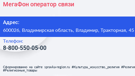 МегаФон, оператор связи по адресу 600026, Владимирская область, Владимир, Тракторная, 45 в дальнейшем Организация, размещена в следующих категориях: