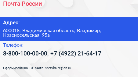 Почта России по адресу 600018, Владимирская область, Владимир, Красносельская, 95а в дальнейшем Организация, размещена в следующих категориях:
