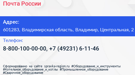 Почта России по адресу 601283, Владимирская область, Владимир, Центральная, 2 в дальнейшем Организация, размещена в следующих категориях: