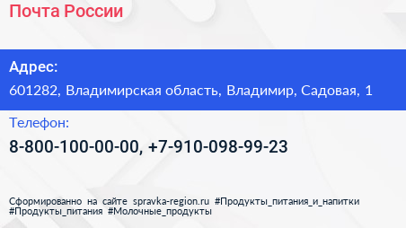 Почта России по адресу 601282, Владимирская область, Владимир, Садовая, 1 в дальнейшем Организация, размещена в следующих категориях: