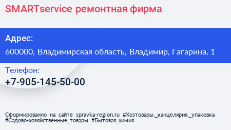 SMARTservice, ремонтная фирма по адресу 600000, Владимирская область, Владимир, Гагарина, 1 в дальнейшем Организация, размещена в следующих категориях: