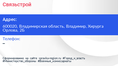 Связьстрой по адресу 600020, Владимирская область, Владимир, Хирурга Орлова, 2Б в дальнейшем Организация, размещена в следующих категориях: