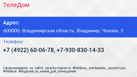 ТелеДом по адресу 600000, Владимирская область, Владимир, Чехова, 1 в дальнейшем Организация, размещена в следующих категориях: