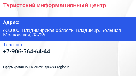 Туристский информационный центр по адресу 600000, Владимирская область, Владимир, Большая Московская, 33/35 в дальнейшем Организация, размещена в следующих категориях: