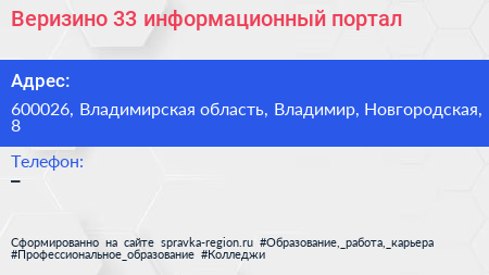 Веризино 33, информационный портал по адресу 600026, Владимирская область, Владимир, Новгородская, 8 в дальнейшем Организация, размещена в следующих категориях:
