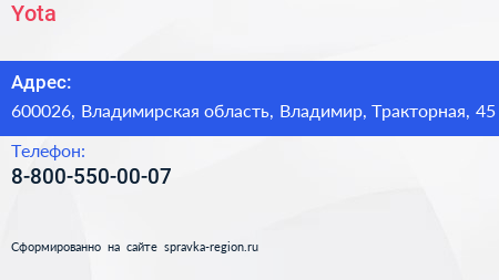 Yota по адресу 600026, Владимирская область, Владимир, Тракторная, 45 в дальнейшем Организация, размещена в следующих категориях: