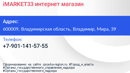 iMARKET33, интернет-магазин по адресу 600009, Владимирская область, Владимир, Мира, 39 в дальнейшем Организация, размещена в следующих категориях:
