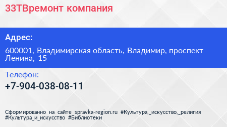 33ТВремонт, компания по адресу 600001, Владимирская область, Владимир, проспект Ленина, 15 в дальнейшем Организация, размещена в следующих категориях: