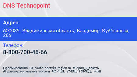DNS Technopoint по адресу 600035, Владимирская область, Владимир, Куйбышева, 28а в дальнейшем Организация, размещена в следующих категориях:
