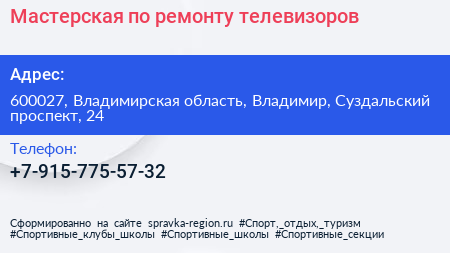 Мастерская по ремонту телевизоров по адресу 600027, Владимирская область, Владимир, Суздальский проспект, 24 в дальнейшем Организация, размещена в следующих категориях: