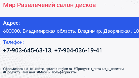 Мир Развлечений, салон дисков по адресу 600000, Владимирская область, Владимир, Дворянская, 10 в дальнейшем Организация, размещена в следующих категориях: